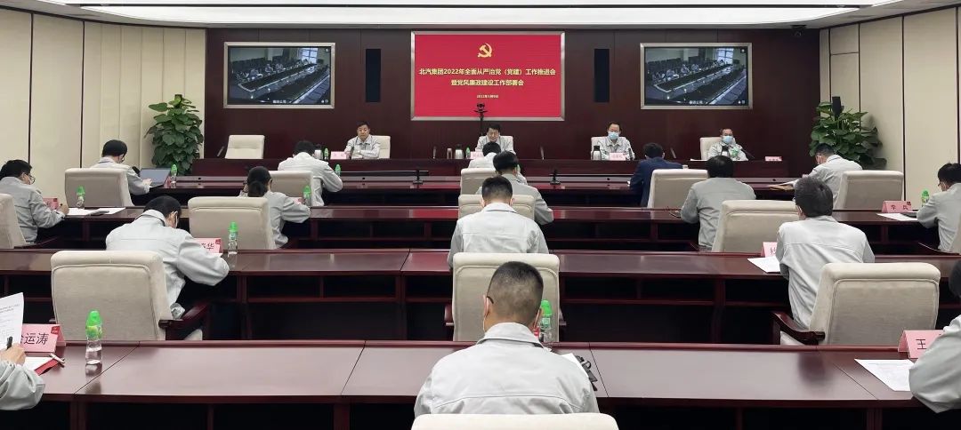集团党委常委、组织部长王建平传达市国资委党建大会精神,发布北汽集团2022年党建工作要点。党委常委、纪委书记、监察专员石喜军部署集团2022年党风廉政建设工作。党委副书记韩永贵发表讲话。会议由党委常委、工会主席张辉主持。