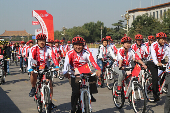 比赛之外,更加引人瞩目的当属“荣誉骑行”环节:只见350位身着专业自行车比赛服的骑手,脚蹬亮眼的公路自行车,紧跟大部队之后,环绕天安门广场进行了1.7公里的骑行。本以为他们也是专业的骑手,一问下来才知道,原来他们都是本次“环京赛”保障团队和赞助团队的工作人员。用“环京赛”组委会负责人的话说就是,希望用“荣誉骑行”这种形式回馈为“环京赛”作出贡献的人们,同时也让他们参与到自行车这项运动员中来,让绿色出行成为新的选择、新的行为方式。