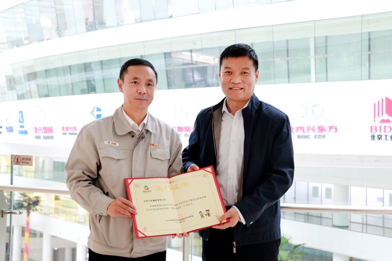12月24日,北京世园局总经济师林晋文一行到访北汽集团,向北汽集团颁发“2019年中国北京世界园艺博览会服务保障特别贡献奖”,并针对北汽集团对世园会服务保障工作的高度重视、倾情服务及人力物力的付出表示感谢。北汽集团党委常委、副总经理蒋自力代表集团领取了奖杯和奖状。