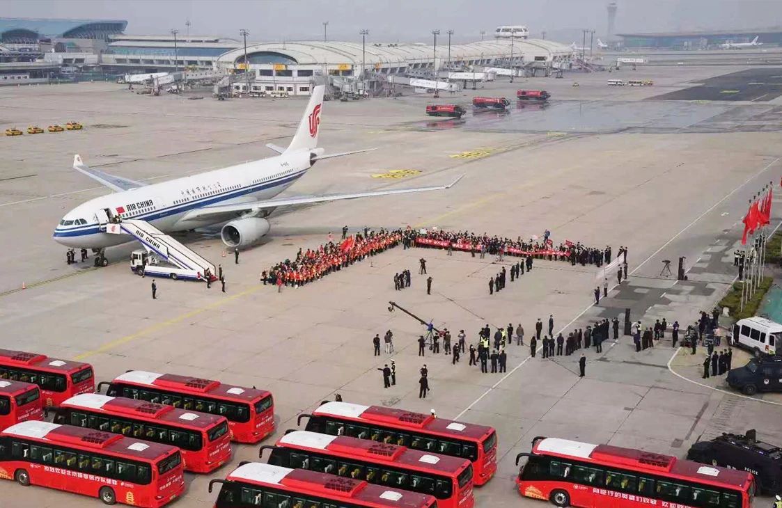 下午2点多,在首都机场停机坪,一辆辆北汽福田欧辉新能源高端商务大巴列队排开,车头装饰着绸布红花,红色车身张贴着“热烈欢迎北京援鄂医疗队凯旋”的标语,静静等待着即将抵达的返京医疗队。终于,医疗队员们乘坐的航班降落在首都机场,机场以民航界最高礼遇“过水门”迎接英雄,为他们“接风洗尘”。舱门缓缓打开,队员们手持国旗、鲜花,依次走下舷梯。前来迎接的队员家属代表、医护人员代表、机场工作人员或肃立注目,或挥手欢呼,以各自的方式向这些北京英雄们表达着最崇高的敬意。