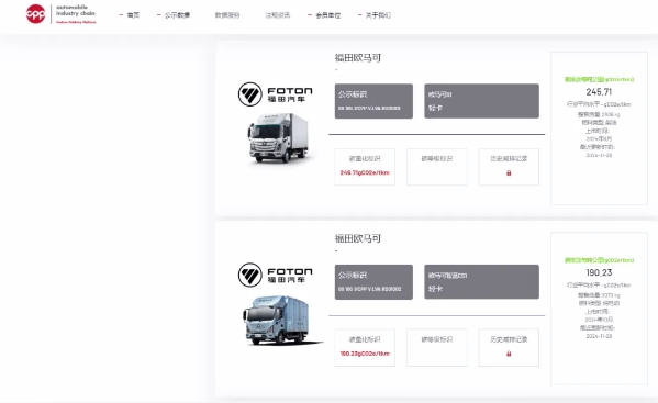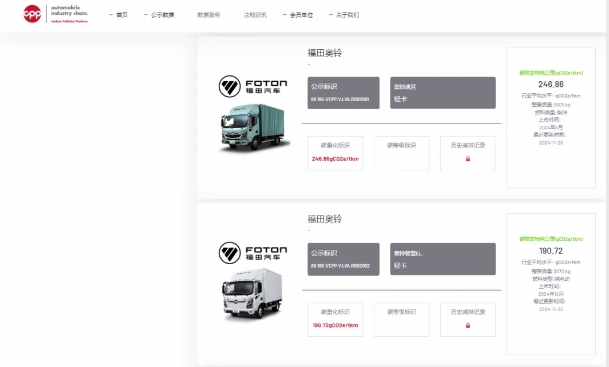 2024年11月26日,北汽福田轻卡欧马可、奥铃4款车型成功通过中国汽车产业链碳公示平台(以下简称“CPP平台”)的严格审核,荣获碳足迹量化标识,这是首批商用车碳足迹量化标识。此次公示,是北汽福田积极践行双碳目标,实现产品绿色低碳转型的有力佐证。