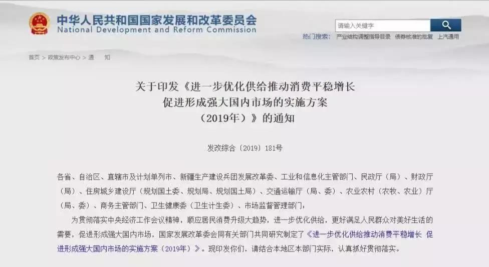 2019年1月29日,国家发改委等十部门印发《进一步优化供给推动消费平稳增长 促进形成强大国内市场的实施方案(2019年)》(以下简称《方案》)。方案制定六大措施促进汽车消费,涉及老旧汽车报废更新、新能源补贴、农村汽车更新换代等方面。《方案》提到,2019年,发改委将促进农村汽车更新换代。有条件的地方,可对农村居民报废三轮汽车,购买3.5吨及以下货车或者1.6升及以下排量乘用车,给予适当补贴,带动农村汽车消费。
