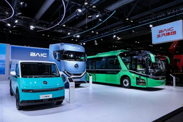 在“智变·新程”北汽集团展台,北汽集团旗下自主乘用车品牌和商用车品牌首次在国际化车展上同台亮相。北京越野BJ40 PLUS右舵版、新X55右舵版、北汽极狐阿尔法S5、北汽极狐阿尔法T5及享界S9增程版等5款面向国际市场的乘用车亮相;作为中国商用车第一品牌,北汽福田带来了风景i(eView)、电动通学车、欧曼银河9等3款重磅产品。