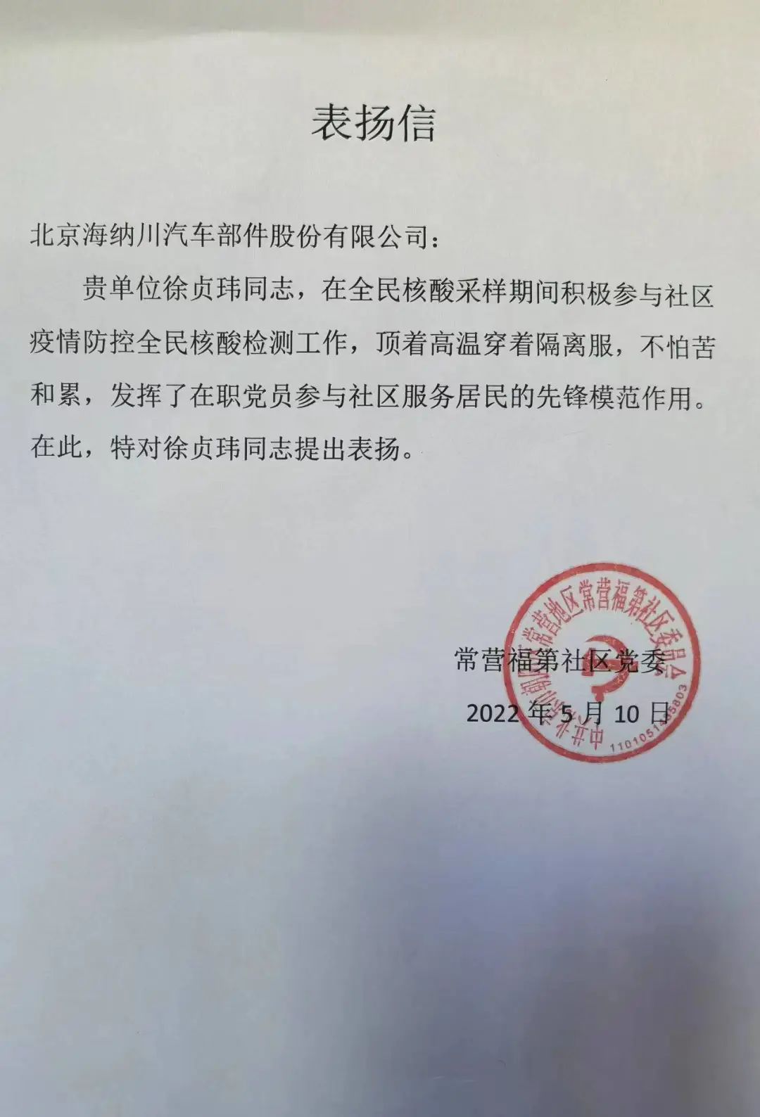 “顶着高温穿着隔离服,不怕苦和累,发挥了在职党员参与社区服务居民的先锋模范作用……”日前,海纳川下沉干部徐贞玮收到一封落款为常营福地社区党委的表扬信,充分肯定了他的表现。