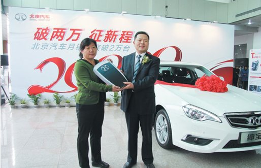 10月31日,在北京天乐国汽汽车技术服务有限公司销售大厅里,家住昌平区的徐宏女士,兴高采烈地从北汽股份执行副总裁陈宏良手中接过绅宝的车钥匙,她不仅有幸成为北京汽车的第20000 辆车主,也和在场的北汽股份总裁李峰等领导、北汽股份销售公司的领导及北京6 家经销商客户代表,一同见证了北京汽车首次月销突破两万台这一令人激动的历史性时刻。徐宏女士非常高兴地说:“我很激动,我开了7 年北京现代的车,就想置换一辆咱们自主品牌的车。对于绅宝轿车,无论是从动力还是配置,外观还是内饰,我都非常满意。我周围的朋友也有开绅宝的,都说非常棒,而且价格也能接受。此外,对于北京汽车的质量我一万个放心。”