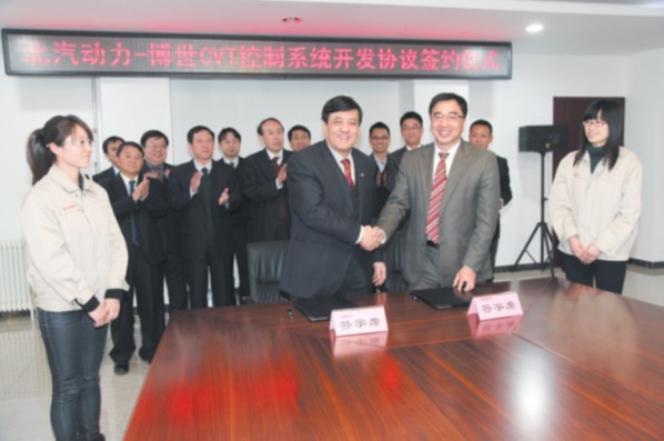 3月20日,北汽动力总成公司与德国博世工程公司就CVT控制系统开发项目进行洽谈,北汽集团副总经理、动力总成公司总经理马童立与德国博世(中国)副总裁徐大全在合作开发协议上签字。