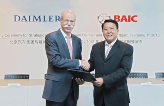 协议确定,戴姆勒将持有北汽股份公司12%股权,成为首家入股中国本土汽车制造商的外资汽车企业。同时,戴姆勒将增持北京梅赛德斯-奔驰销售服务有限公司1%的股份至51%。此外,双方达成的协议还包括戴姆勒将向北汽股份公司董事会派两名董事,致力于北汽自主品牌乘用车的发展。本次北汽集团与戴姆勒签署的合作协议,是2013 年中国乃至全球汽车行业的一件大事,此举改变了合资汽车企业中外股比50 对50 的传统格局,为中国汽车行业合资合作开创了一个崭新的局面。北汽集团董事长表示,北汽与戴姆勒的合作已经迈入了一个最良好的时期,更深层次的合作符合双方的利益和发展。戴姆勒持股北汽股份将有利于在资金、技术、管理、品牌等各个方面促进北汽自主品牌的快速发展,同时也将对提升奔驰品牌在中国的市场表现起到推动作用。